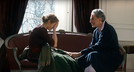 Si parte con un totale che mette in scena: in secondo piano la stanza, con il vestito da sposa su un lato e il divano su cui dorme tutta coperta Alma dall’altro, mentre in primo piano sfocate abbiamo due sedie. La cinepresa è posizionata poco più in alto del pavimento componendo questi due piani, uno dove avverrà l’azione e l’interazione dei personaggi (il secondo) e il primo sfocato a incorniciarlo. In quest’ultimo il sotto del tavolo funge da doppio soffitto a ricreare un’iniziale oppressione sia visiva che narrativa: per farla in breve nella prima parte la nostra Alma, interpretata da Vicky Krieps, è schiacciata dall’ego dell’amante, Daniel Day Lewis nel ruolo del maniacale sarto Woodcock. Un’oppressione che è data anche dallo sbilanciamento dell’inquadratura per via dell’ingombrante presenza del vestito da sposa (bianco su sfondo bianco), che raffigura sia l’imminente proposta di matrimonio da parte di lui, un presagio quasi ostile di imposizione sociale, sia il mestiere ed il lavoro insegnatogli dalla madre, ciò che lo identifica, il suo legame morboso con il materno: il suo interesse ossessivo, la sua vita prima di Alma. Il vestito è sia il mezzo che l’ostacolo, una sineddoche del passato e dell’imminente futuro.