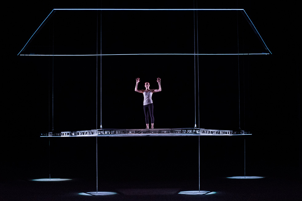 Acceca e destabilizza Grounded per l’amarissima attualità che inevitabilmente intercetta in questi giorni accesi dal conflitto Russo-Ucraino. Nella prova completa e robusta dell’attrice Linda Gennari risiede un sedimentato involucro di tensione psicologica, smosso anche dal sinuoso movimento lento della scenografia che ricalca e ricalibra il volteggiare aereo di un F16, il personalissimo di Linda, abbandonato per i droni, si chiamava Tiger. Una rampa metallica incorniciata da strisce di led che cambiano colore a seconda dell’atmosfera, dà forma e crea piani e traiettorie laser che scandiscono, dividono e frammentano lo spazio scenico in fessure e quadri che lo spettatore può osservare. Al centro, sempre lei, la nostra pilota con il suo flusso di coscienza, e grazie al variare elettronico delle linee musicali e della voce, il racconto prosegue in capitoletti rapidi che si accendo e si spengono al variare dell’umore del personaggio in scena. Gradualmente sprofonda nello squilibrio mentale, corroborato da tutto l’apparato tecnico che rimane comunque minimale, lisergico ed efficacissimo.