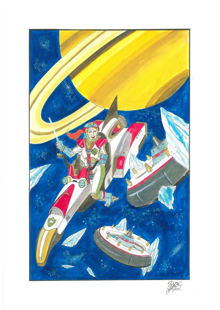È stata così organizzata una missione di salvataggio capitanata dall’espertissima astronauta Cristofora Colombo. Per l’occasione, le è stata fornita di una tuta aerospaziale superaccessoriata. È pronto lo shuttle che la porterà oltre lo strato più alto dell’atmosfera terrestre, per arrivare nelle immediate vicinanze del pianeta Saturno.
